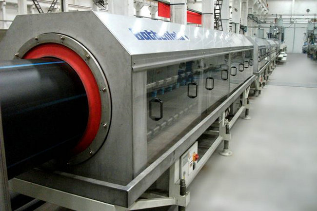 2、采用專有技術的定徑和冷卻系統,采用水膜潤滑和水環式的冷卻,以適應HDPE、PE物料的要求,確保高速生產厚壁管是直徑和圓度的穩定。